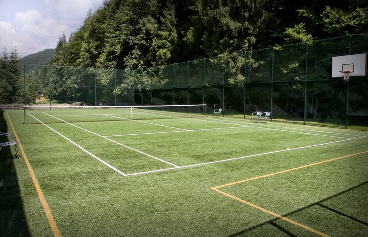 Teren multifuncțional în aer liber, amenajat pentru activități sportive. Poate fi folosit pentru tenis de câmp, fotbal sau baschet, în funcție de preferințe.